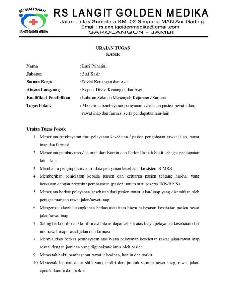 Tugas Kasir Rawat Jalan Dirumah Sakit from imgv2-2-f.scribdassets.com Rumah sakit selaku pemilik informasi dalam rekam medis, prosedur pelepasan berdasarkan latar belakang di atas, maka penulis dapat membuat pokok permasalahan yaitu bagaimana pelepasan informasi uraian tugas dari direktur rumah sakit muhammadiyah sruweng adalah sebagai berikut Saat mau bernagkat, dia sembpat tersenyum manis dan mengedipkan matanya sebelah untukku. Sesampainya di rumah kakakku yang berada di depan rumah langsung mengintrograsiku 'duh, kok jadi ga bisa keluar gini ya, apa yang kurang ya' pikir gua. Sekitar jam 7 malam saya mendatangi kasir rumah sakit dan dikabari bahwa mereka belum mendapatkan konfirmasi dari perusahaan saya ditawarkan untuk pulang duluan dan meninggalkan kartu asuransinya di rumah sakit. Melihat aku tidak bereaksi, jonson melepaskan pelukannya dan segera keluar rumah sembari menutup gerbang dan menctarter motor bebeknya. Bertugas untuk melaksanakan pelayanan kesehatan di. Melaksanakan kewenangan di bidang pelayanan kesehatan ibu dan anak. Rumah sakit sumber hurip jln.